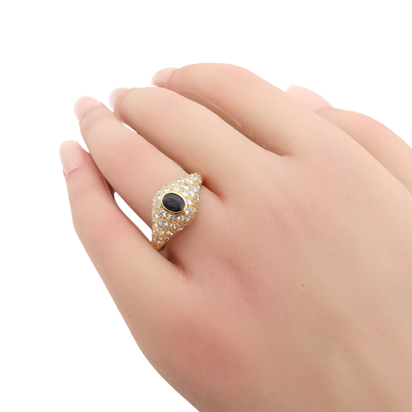 Bague en or jaune 18 carats pesant 5.20 grammes sertie au centre d'un saphir taille ovale de 0.50 ct et entouré de diamants taille brillent d'environ 2.24 ct